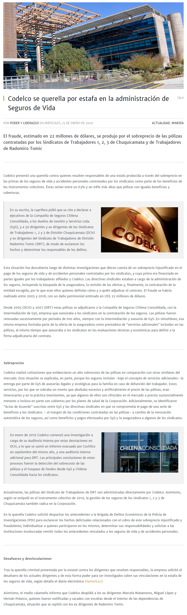 Chilena Consolidada admitió a Codelco irregularidades en el cobro de seguros - (La Segunda)