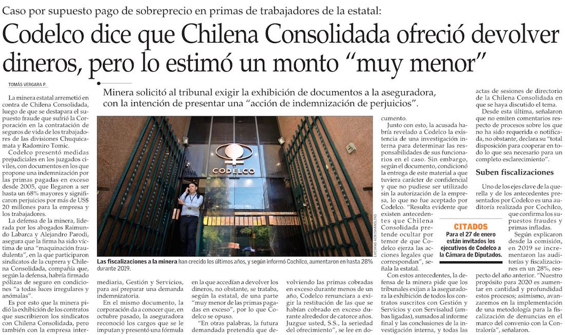 Chilena Consolidada admitió a Codelco irregularidades en el cobro de seguros - (La Segunda)