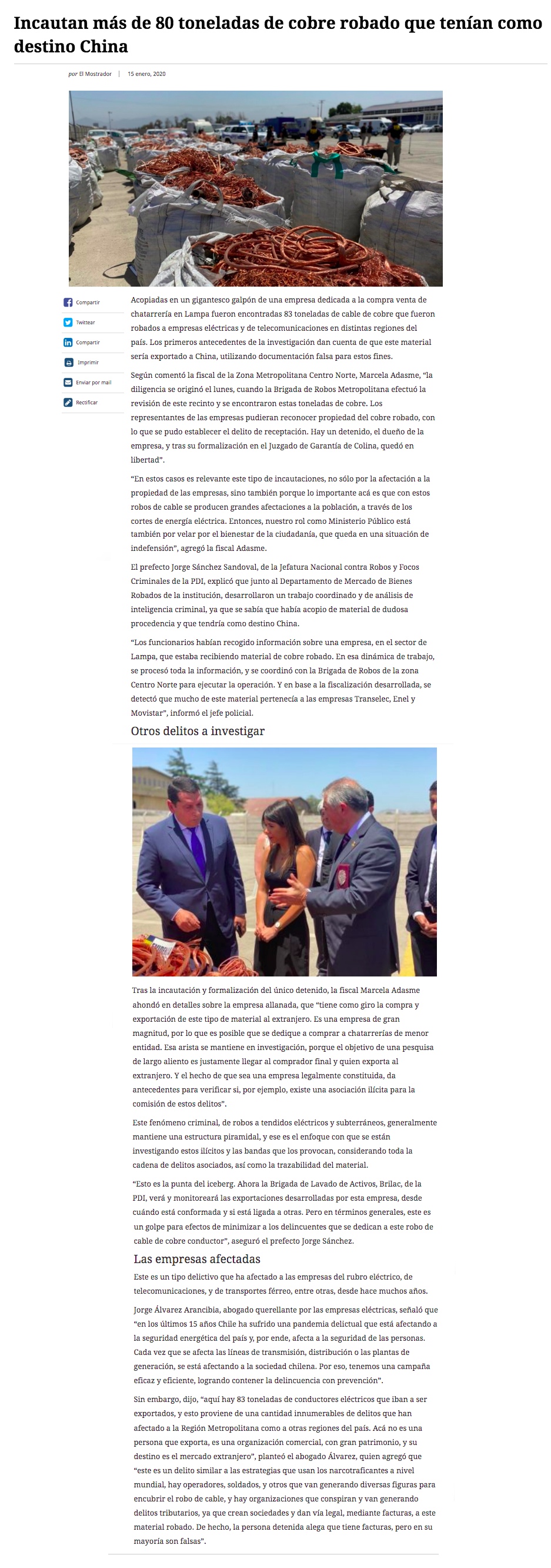 Incautan 84 toneladas de cables de cobre que habían sido robados en el país: hay un detenido - (biobiochile online)