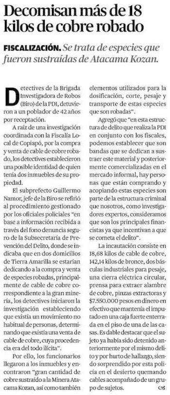 Sujeto fue detenido en Tierra Amarilla: Robaba cables de cobre de minera Atacama Kozan - (atacamanoticias)