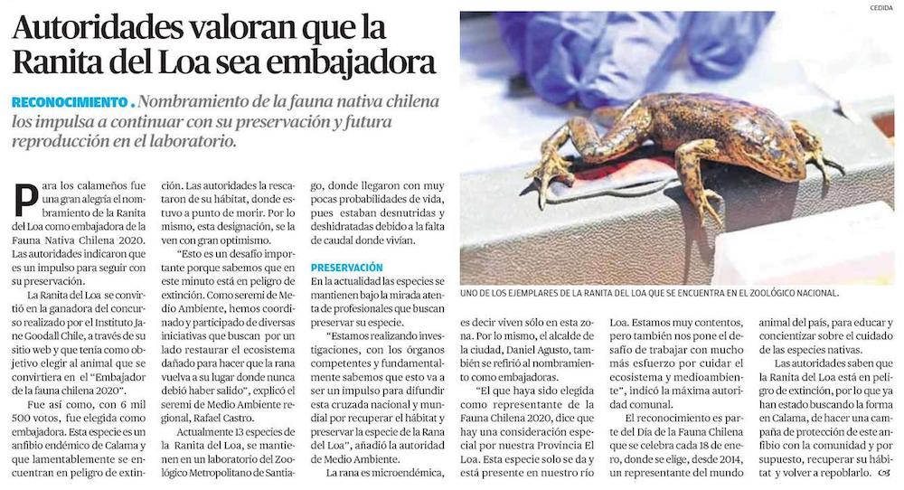Ranitas de El Loa fueron elegidas embajadoras de la fauna chilena 2020 - (El Mercurio de Calama)
