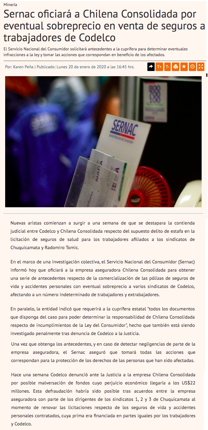 Sernac oficia a Chilena Consolidada por sobrecostos de Codelco - (Pulso)
