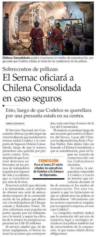 Sernac oficiará a Chilena Consolidada por eventual sobreprecio en venta de seguros a trabajadores de Codelco - (DF Online)
