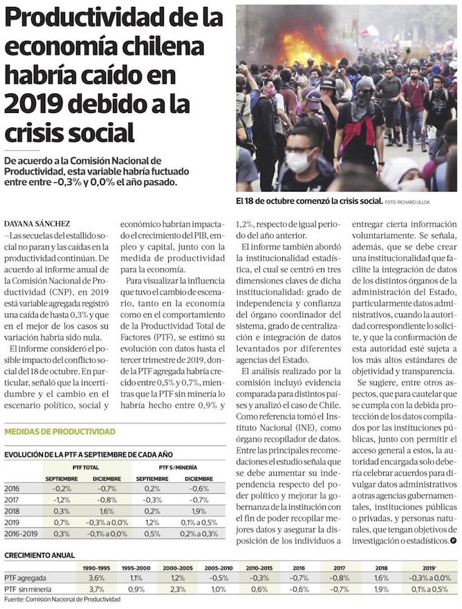 Crisis social impactó productividad en 2019 y habría caído hasta 0,3%, el menor registro en dos años - (El Mercurio de Santiago)