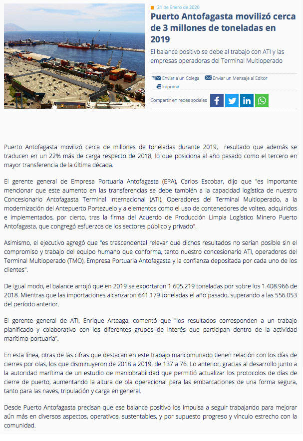 Puerto Antofagasta movilizó cerca de 3 millones de toneladas en 2019 - (mch.cl)