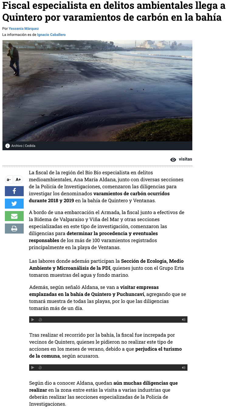 Fiscalía indaga a empresas de la bahía de Quintero por los varamientos de carbón - (El Mercurio de Valparaíso)