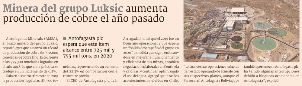Antofagasta Minerals registró producción récord de cobre durante 2019 - (reporteminero)