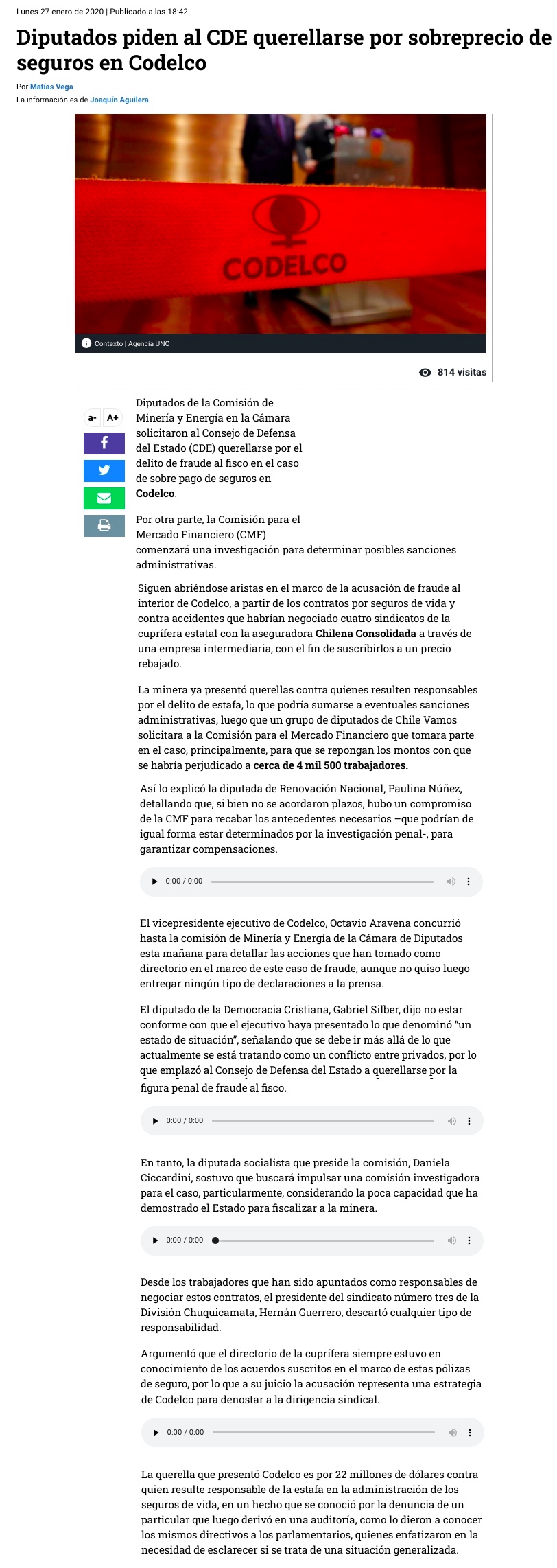 Diputados discrepan de estrategia de Codelco en caso Seguros y sindicatos apuntan al rol de la administración - (El Mercurio de Santiago)