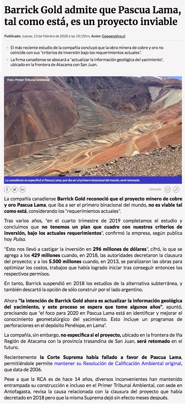 Barrick Gold actualizará información geológica de Pascua Lama pero ya califica proyecto como “inviable” - (La Región)