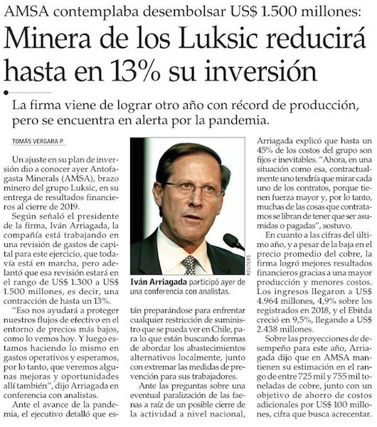 Minera del grupo Luksic por coronavirus: “Creemos que nos colocamos en una posición sólida para la incertidumbre futura” - (Pulso Online)