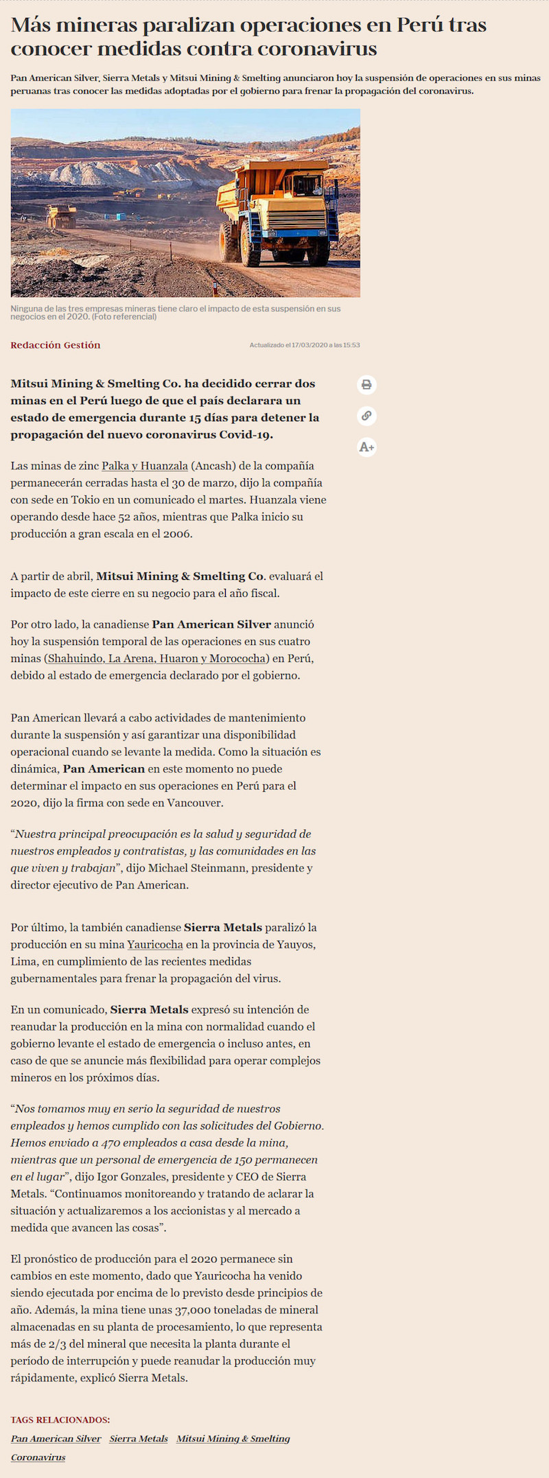 Sector minero seguirá operando pero con menor capacidad durante Estado de Emergencia - (Gestión Online (Perú))