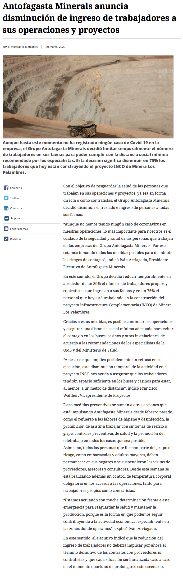 Antofagasta Minerals anuncia disminución de ingreso de trabajadores a sus faenas - (Pulso)
