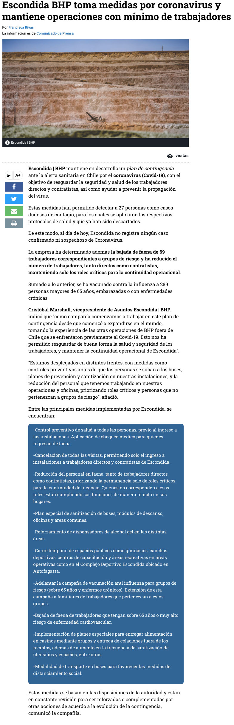 COVID-19: mineras reducen cantidad de funcionarios e implementan teletrabajo - (Estrella de Iquique)