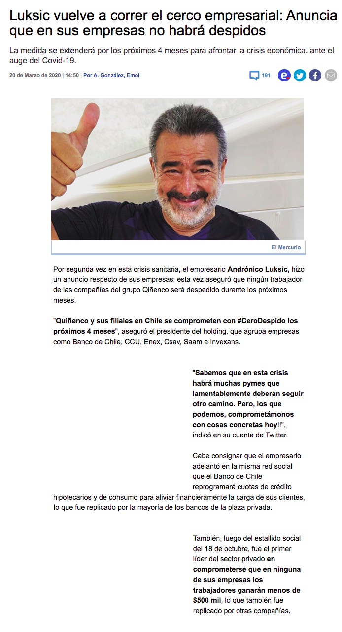 Las medidas del Grupo Luksic para enfrentar el coronavirus - (DF Online)