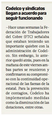 Sindicatos de Chuqui piden adoptar cuarentena y equipos de servicios mínimos - (Diario Financiero)