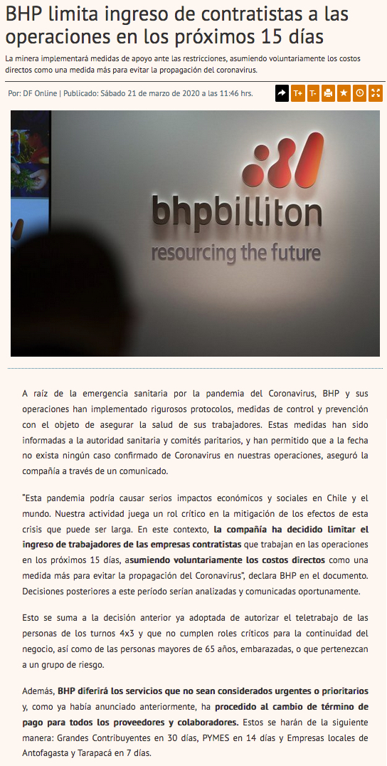 BHP implementa medidas para apoyar a empresas contratistas - (El Mercurio de Antofagasta)