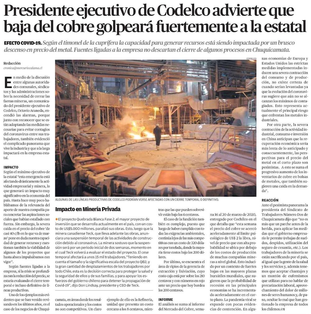 Efecto coronavirus: Codelco reconoce que crisis pone en duda su "capacidad de generar recursos" - (cooperativa online)