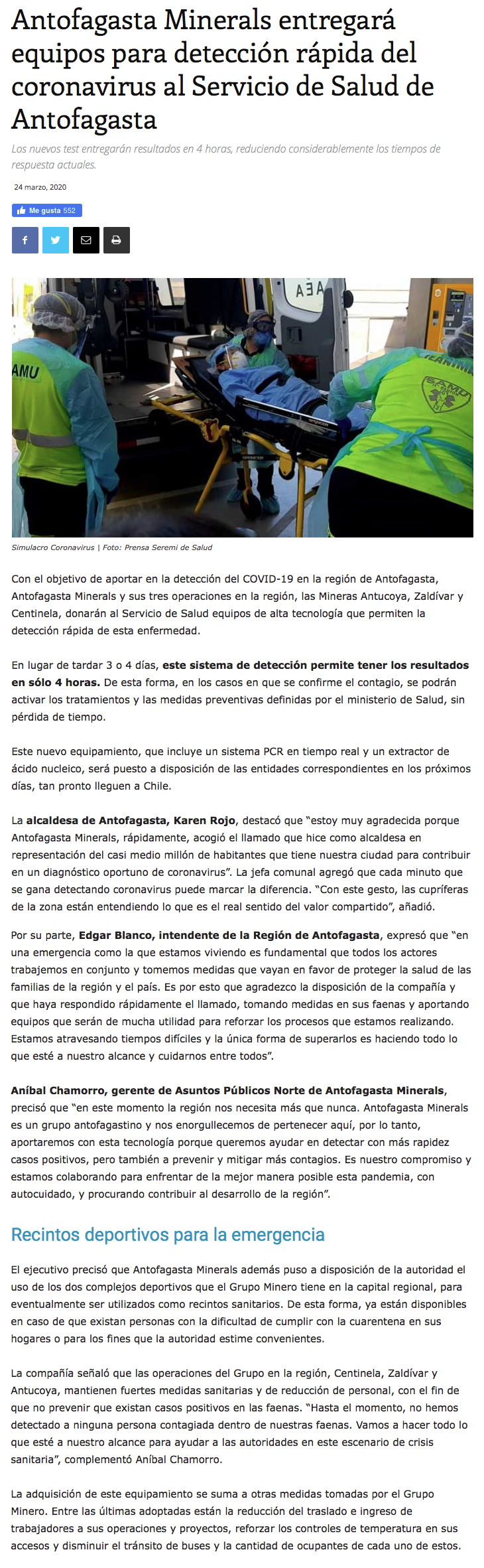 Antofagasta Minerals entregará equipos para detección rápida del Covid-19 - (mch.cl)