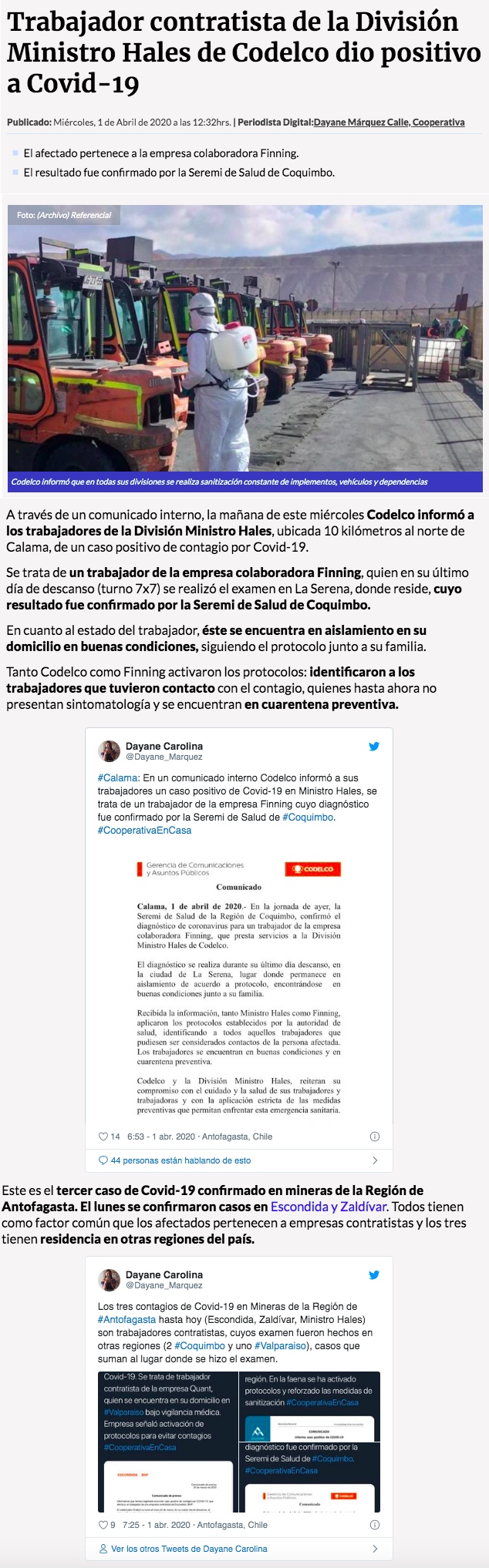 Contratista de división Ministro Hales es el tercer minero contagiado con COVID-19 en la región - (El Mercurio de Calama)