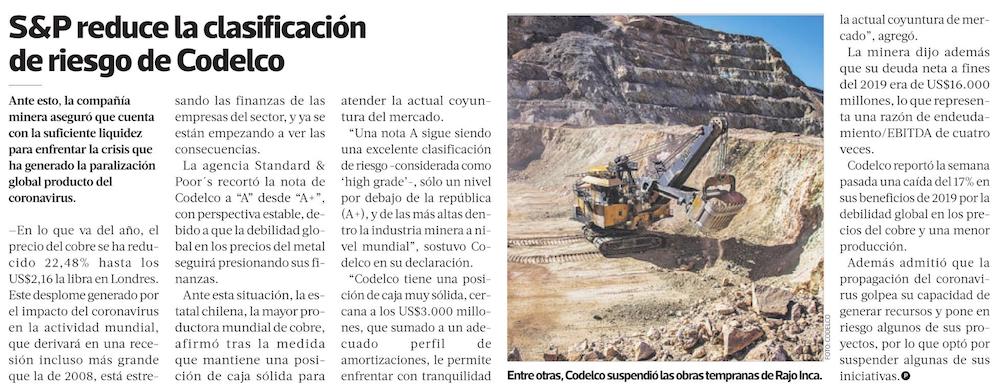 S&P baja clasificación de Codelco y advierte un déficit de hasta US$ 800 millones para 2021 - (Diario Financiero)