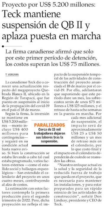 Teck mantiene suspendidas obras de Quebrada Blanca 2 y detalla aumentos de costos - (Diario Financiero)