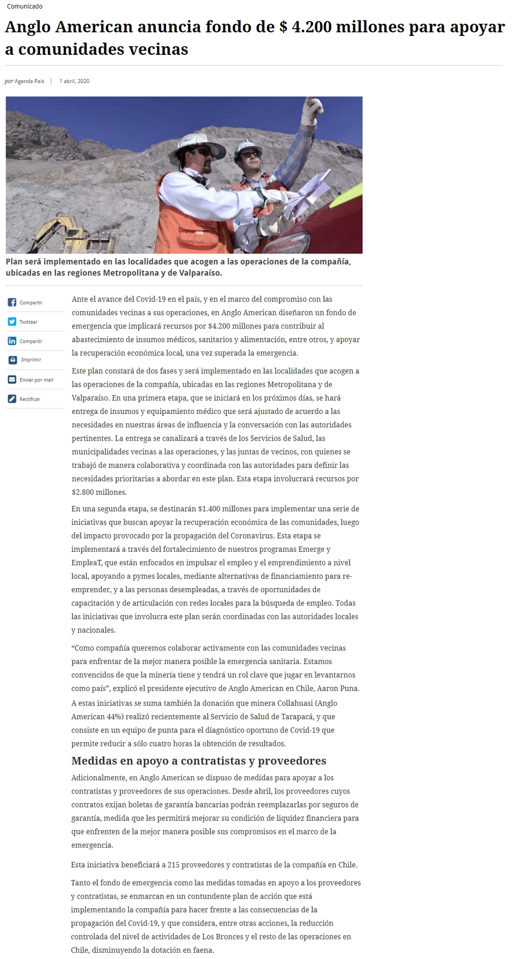 Anglo American anuncia fondo por casi US$5M para apoyar a comunidades vecinas en Chile ante el coronavirus - (americaeconomia online)