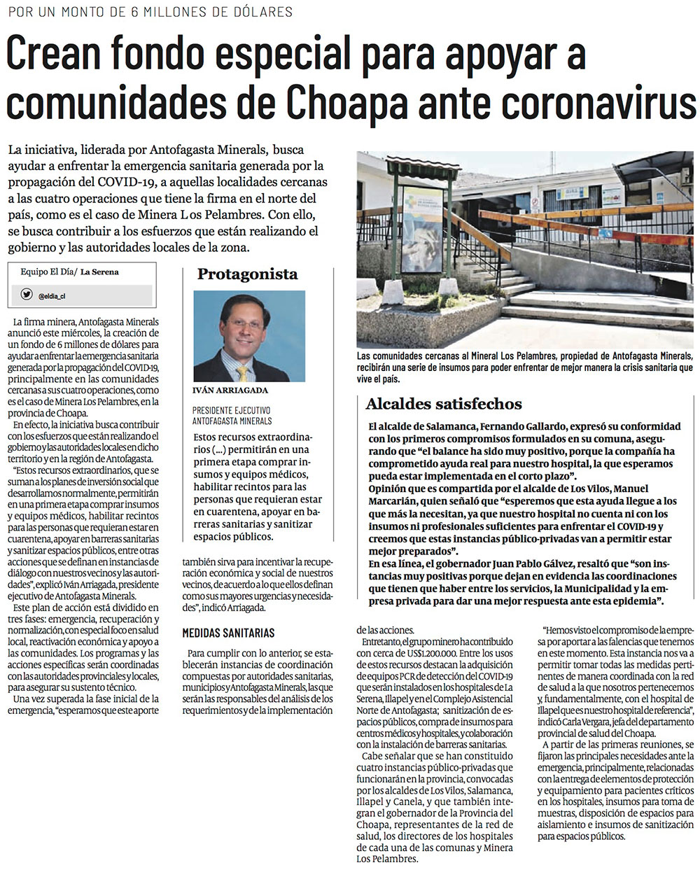 Antofagasta Minerals crea fondo para ayudar a comunidades por Covid-19 - (La Región)