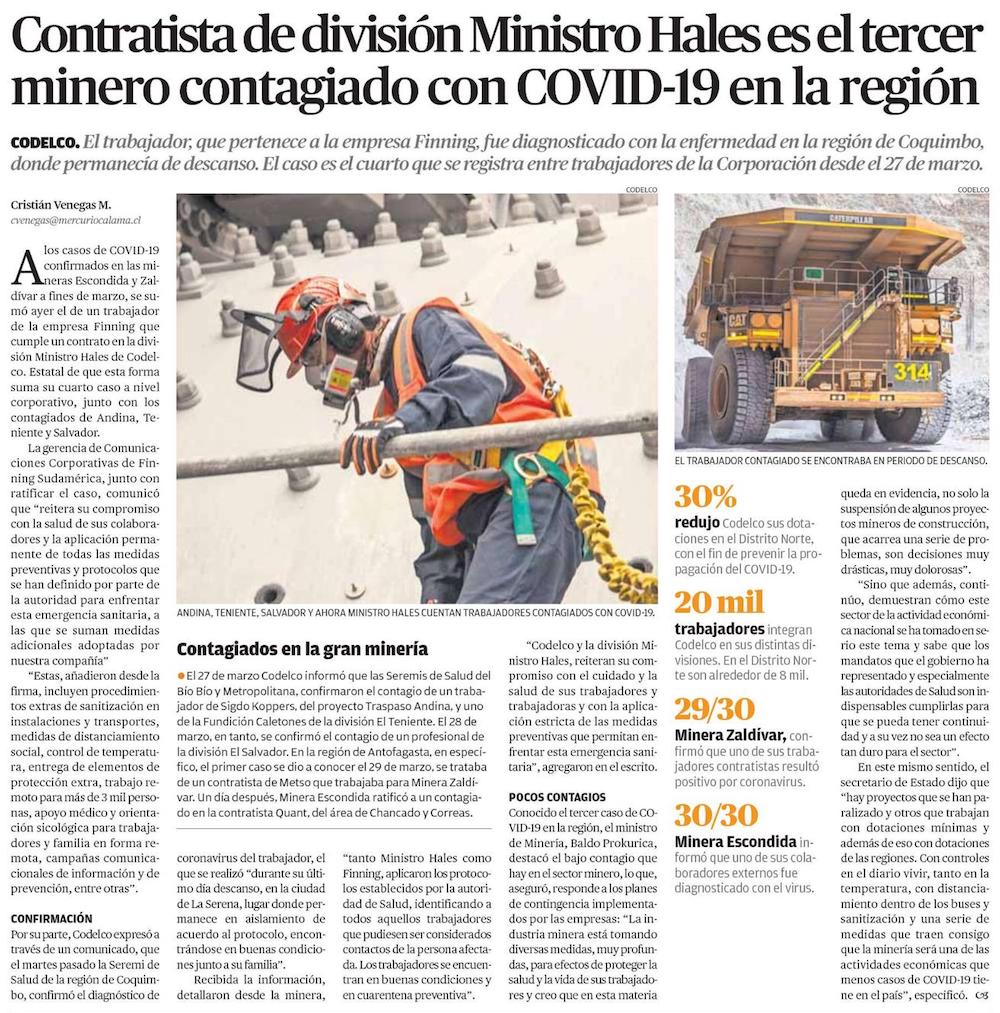 Trabajador contratista de la División Ministro Hales de Codelco dio positivo a Covid-19 - (cooperativa online)
