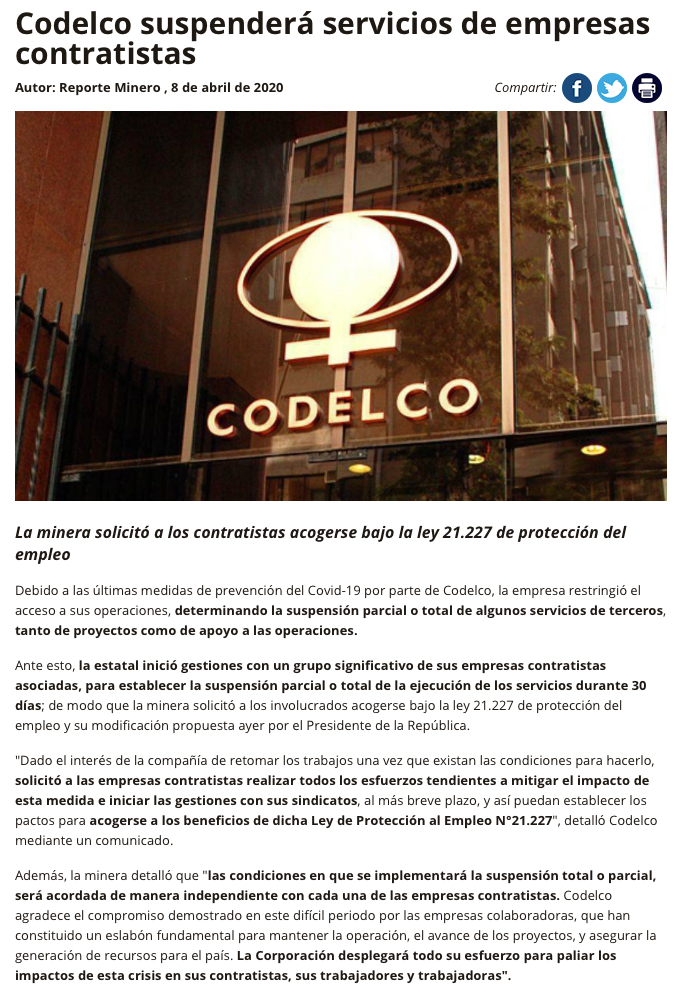 Codelco suspende contratos en operaciones y proyectos a 30% de sus empresas contratistas - (El Mercurio de Calama)