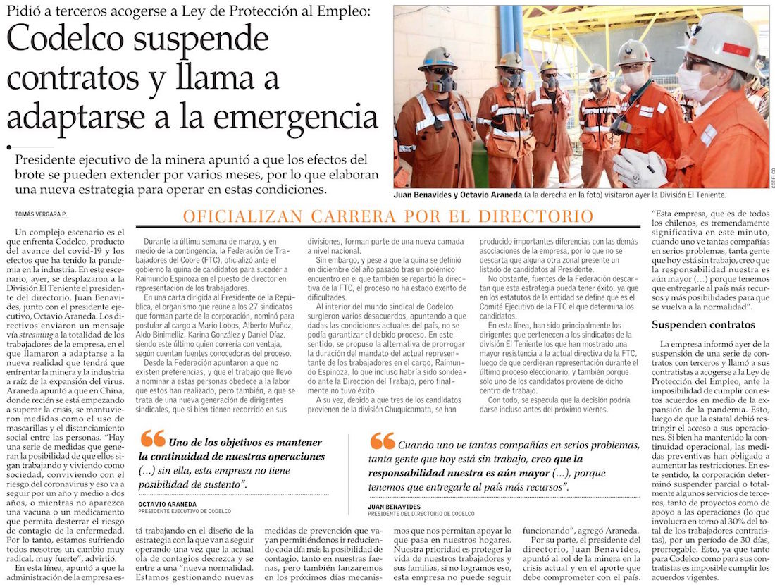 Codelco suspende contratos en operaciones y proyectos a 30% de sus empresas contratistas - (El Mercurio de Calama)