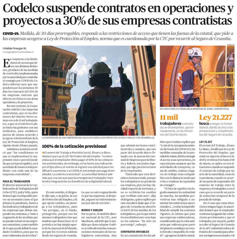 Codelco suspende contratos y llama a adaptarse a la emergencia - (El Mercurio de Santiago)