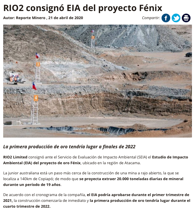 Canadiense Rio2 ingresa proyecto aurífero por US$200 millones - (La Segunda)