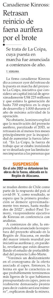 Kinross reconoce atraso de tres meses en primera producción de La Coipa por efecto del coronavirus - (Diario Financiero)