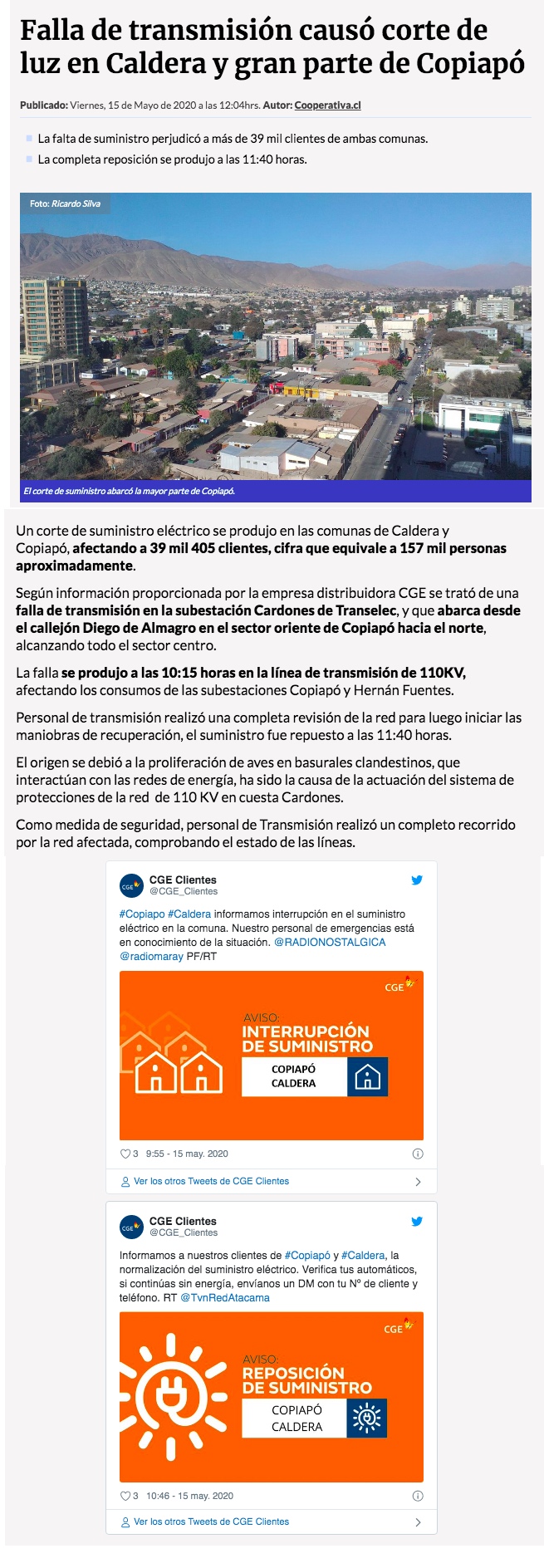 Más de 39 mil clientes afectados por corte de suministro eléctrico en Copiapó y Caldera - (El Chañarcillo)