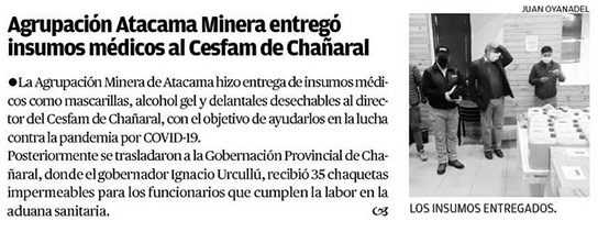 Agrupación Atacama Minera realiza donaciones de utensilios de prevención para el Covid-19 a Cesfam "Luis Herrera" y Gobernación de Chañaral - (El Chañarcillo)