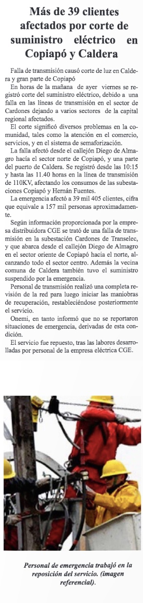 Falla de transmisión causó corte de luz en Caldera y gran parte de Copiapó - (cooperativa online)