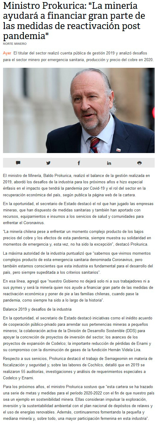 Ministro Prokurica: La minería ayudará a financiar gran parte de las medidas de reactivación económica cuando pase la pandemia - (El Longino de Iquique)
