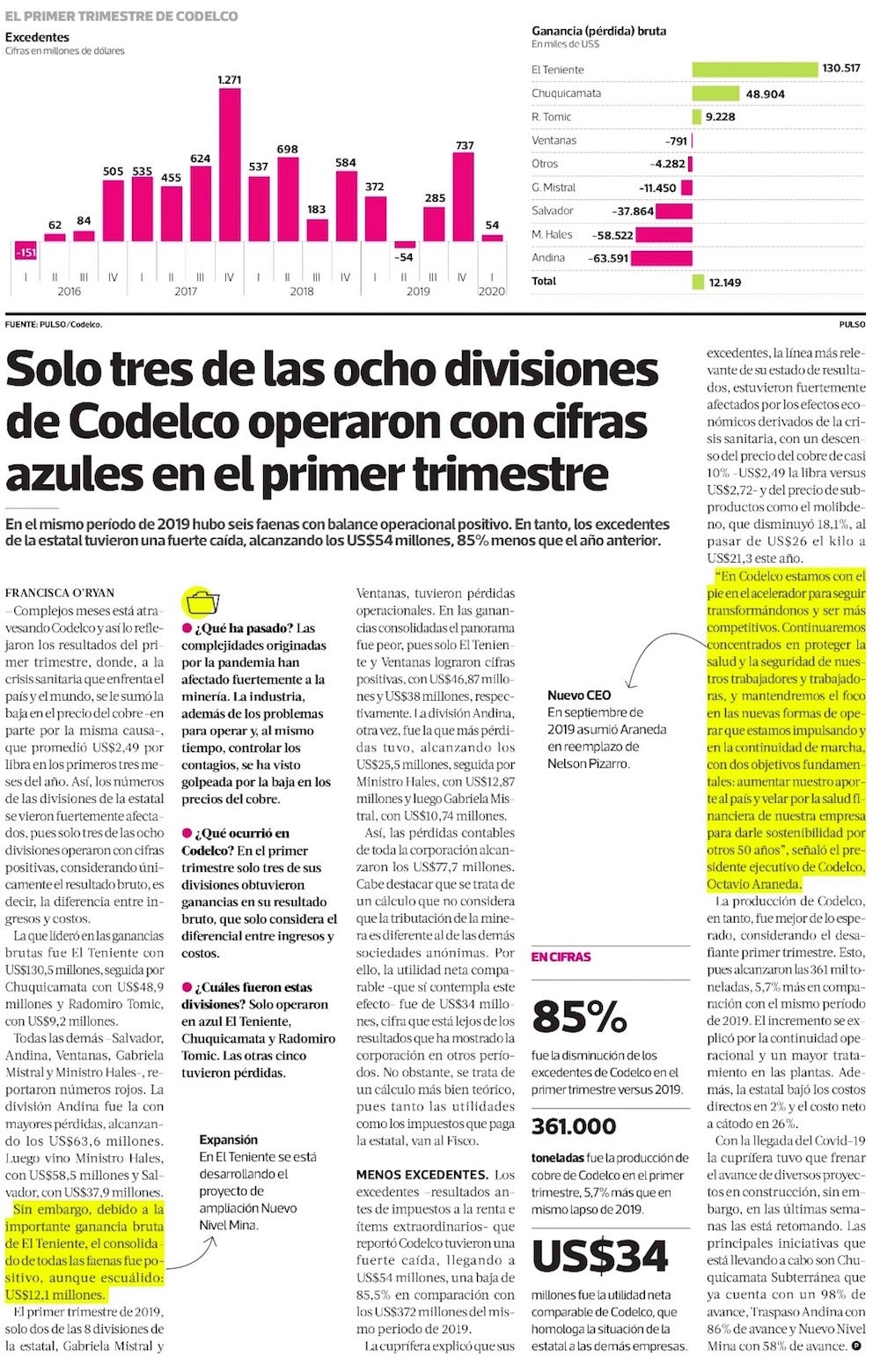 Excedentes de Codelco bajan 85% durante el primer trimestre - (El Mercurio de Antofagasta)