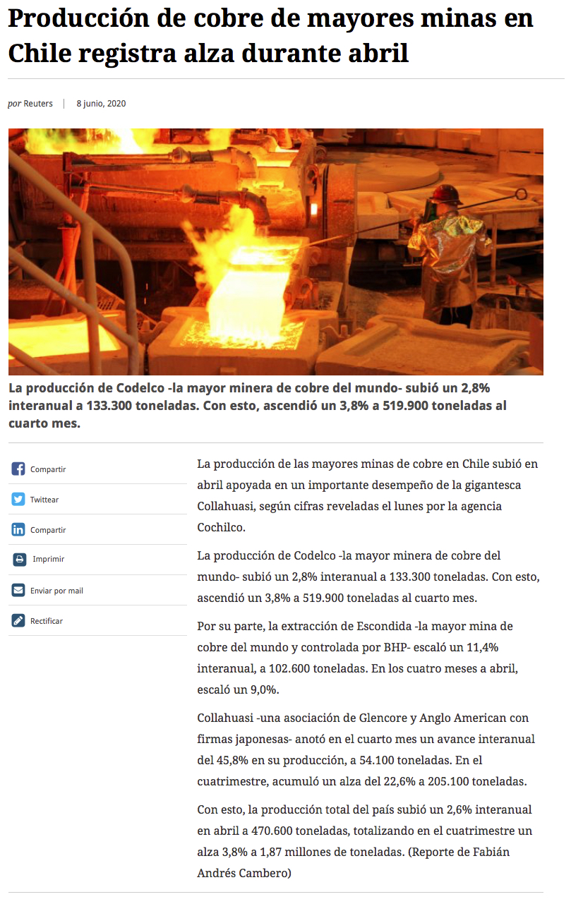 Producción de cobre de grandes mineras avanzó en abril - (Pulso)