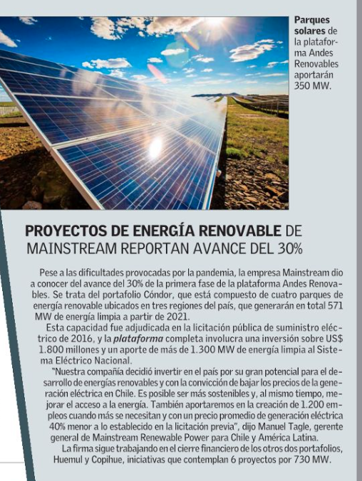 Mainstream avanza en proyectos solares y eólicos - (Diario Financiero)