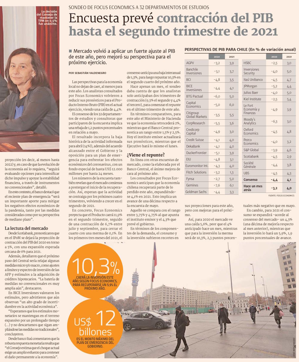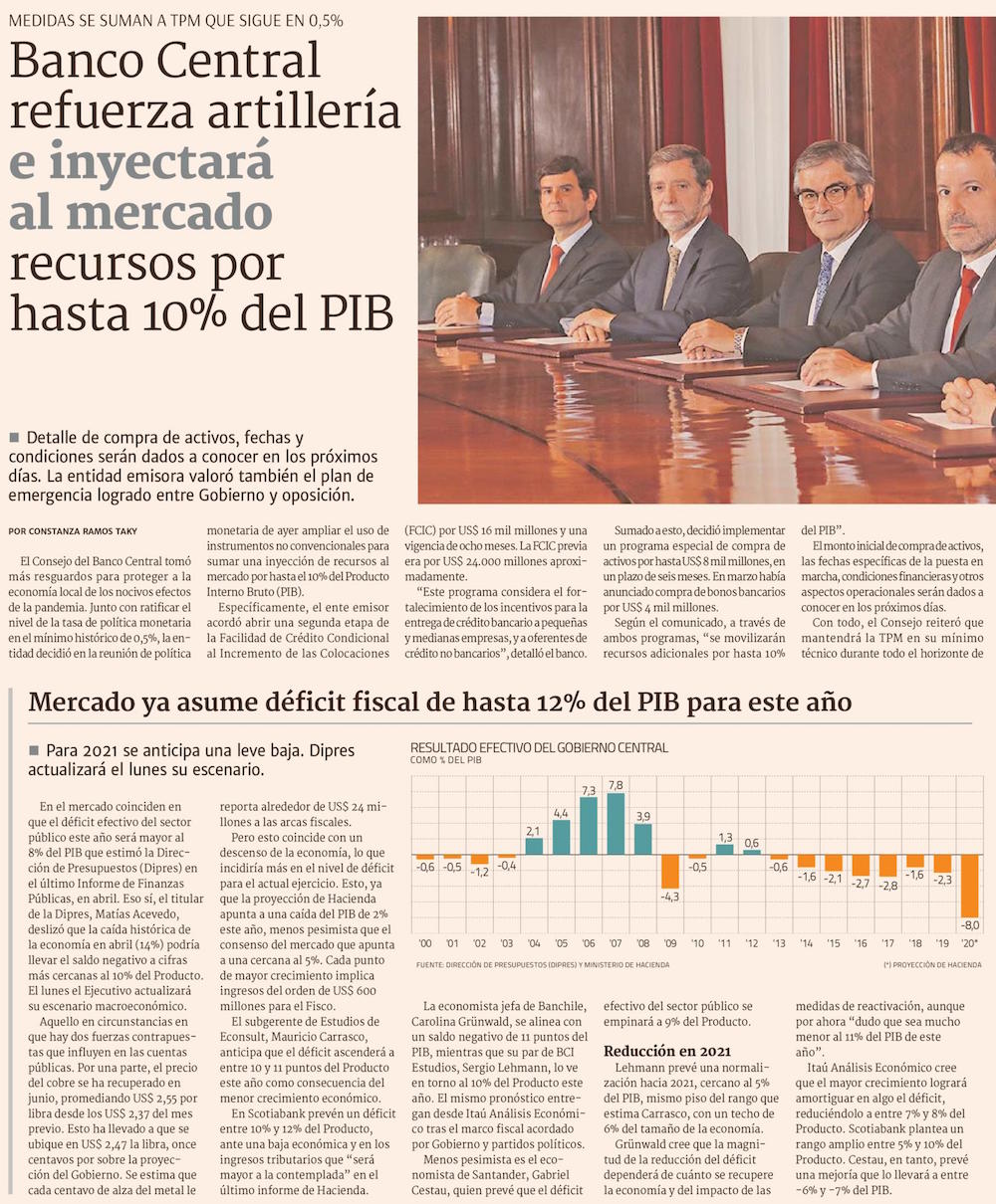 Banco Central asegura que tasa de interés seguirá en su nivel mínimo por dos años y anuncia más medidas de liquidez - (El Mercurio de Santiago)