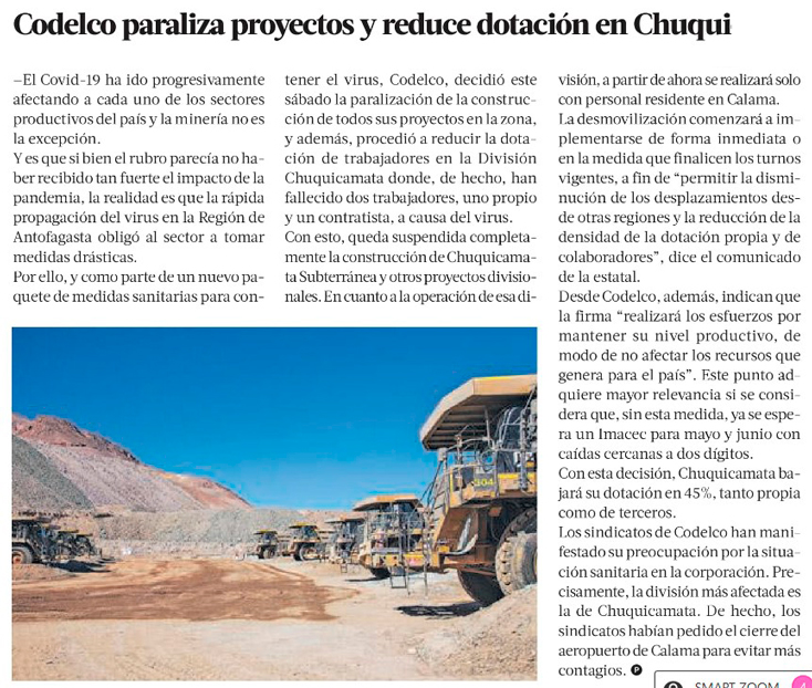 Codelco detiene proyectos en faenas nortinas y retira al 45% del personal de Chuquicamata - (El Mercurio de Santiago)