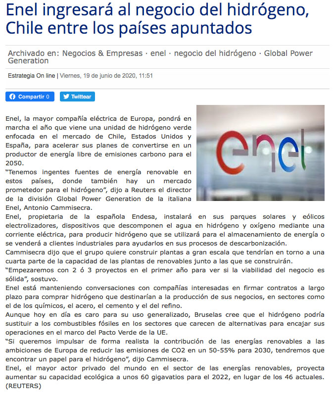 Enel ingresa al negocio del hidrógeno y apunta a Chile - (El Mercurio de Santiago)