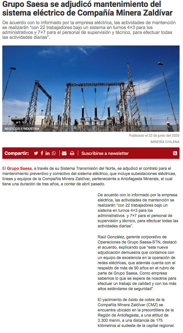 Grupo Saesa se adjudicó mantenimiento del sistema eléctrico de Compañía Minera Zaldívar - (revistaei.cl)