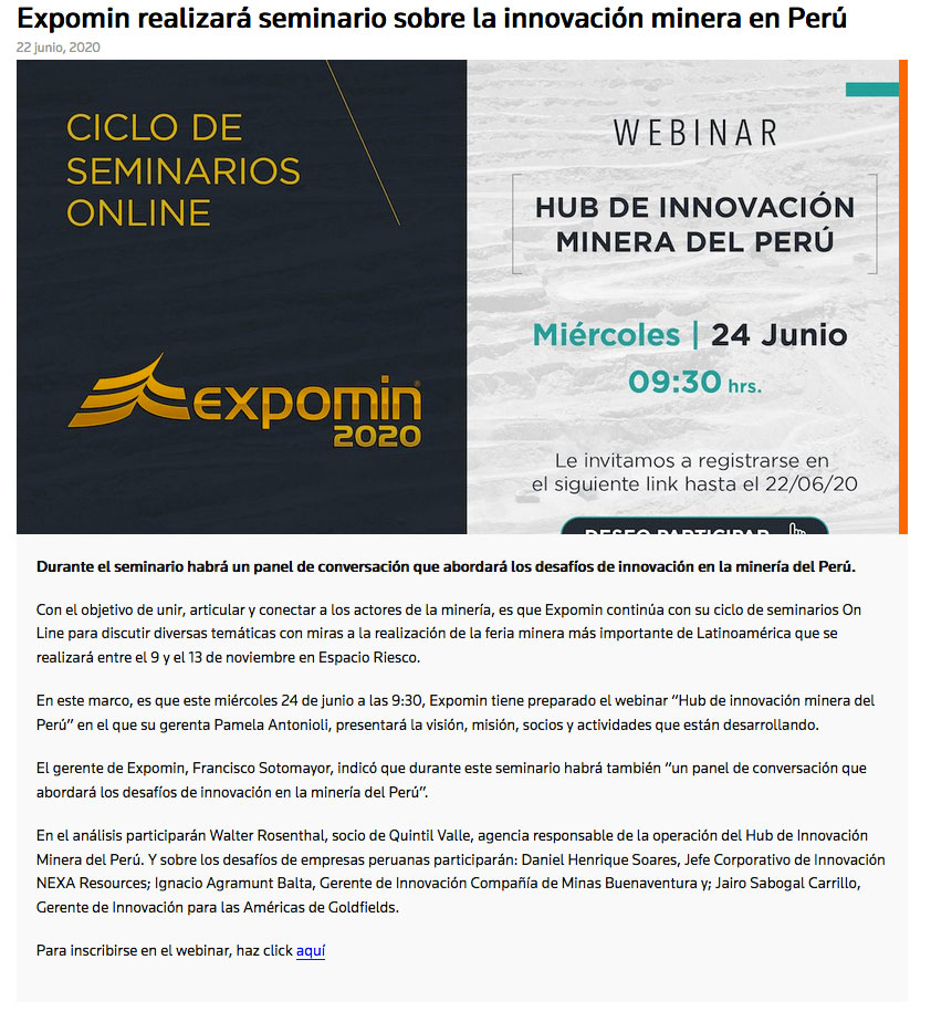 Expomin desarrollará seminario online sobre retos en innovación de la minería peruana - (mch.cl)