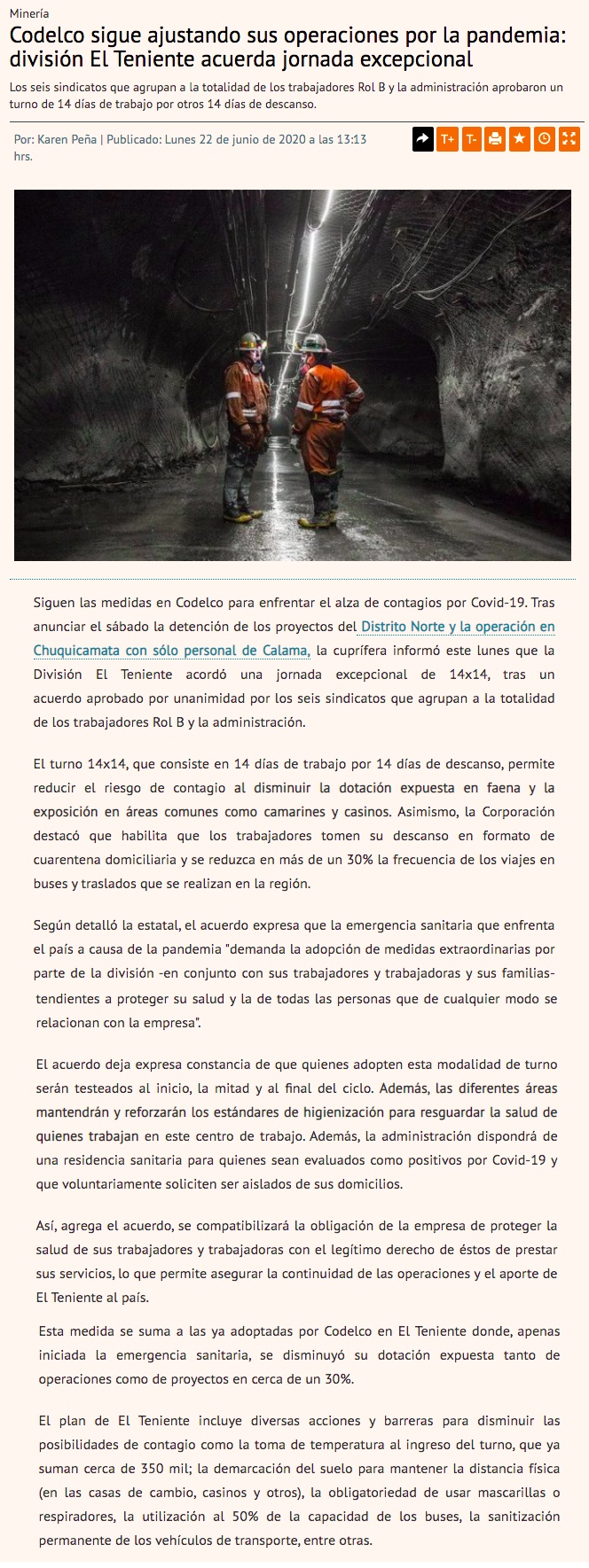 Codelco anuncia nuevas medidas para enfrentar emergencia por coronavirus: División El Teniente acuerda jornada excepcional de trabajo - (Pulso Online)