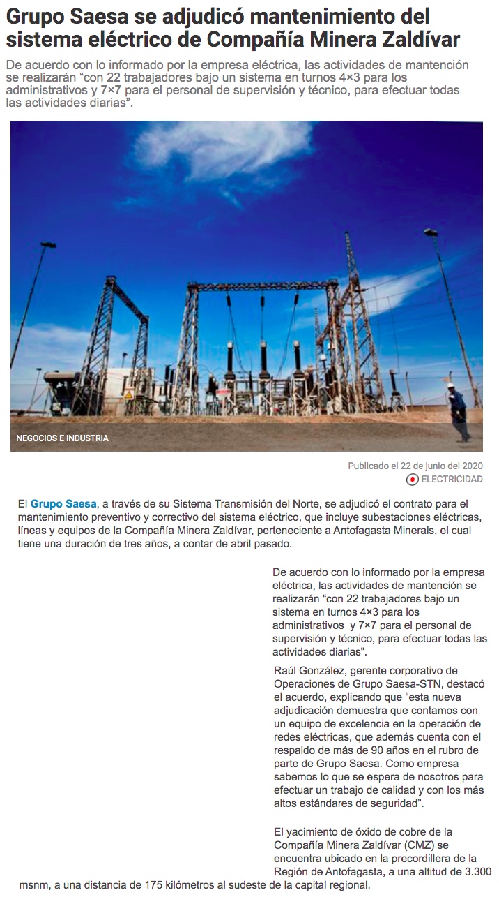 Grupo Saesa se adjudicó mantenimiento del sistema eléctrico de Compañía Minera Zaldívar - (mch.cl)