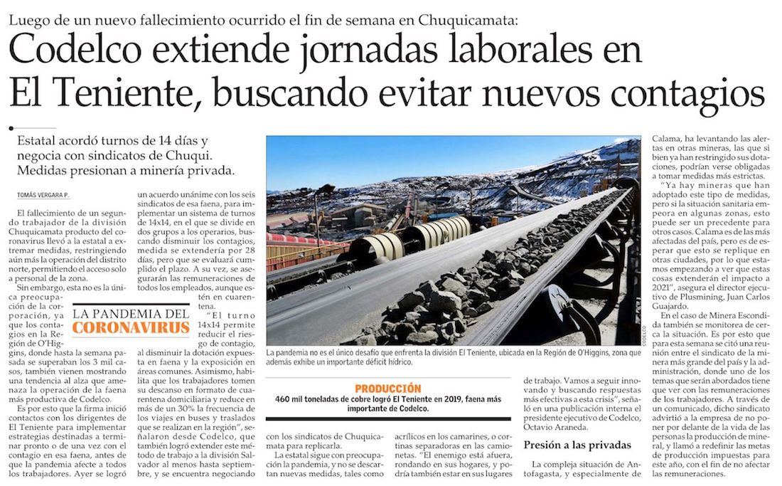 Codelco anuncia nuevas medidas para enfrentar emergencia por coronavirus: División El Teniente acuerda jornada excepcional de trabajo - (Pulso Online)