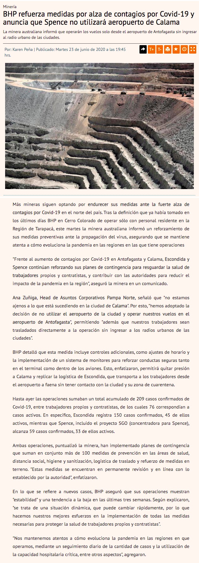 Operaciones de BHP en Antofagasta refuerzan medidas preventivas ante aumento de contagios por Covid-19 - (Pulso Online)