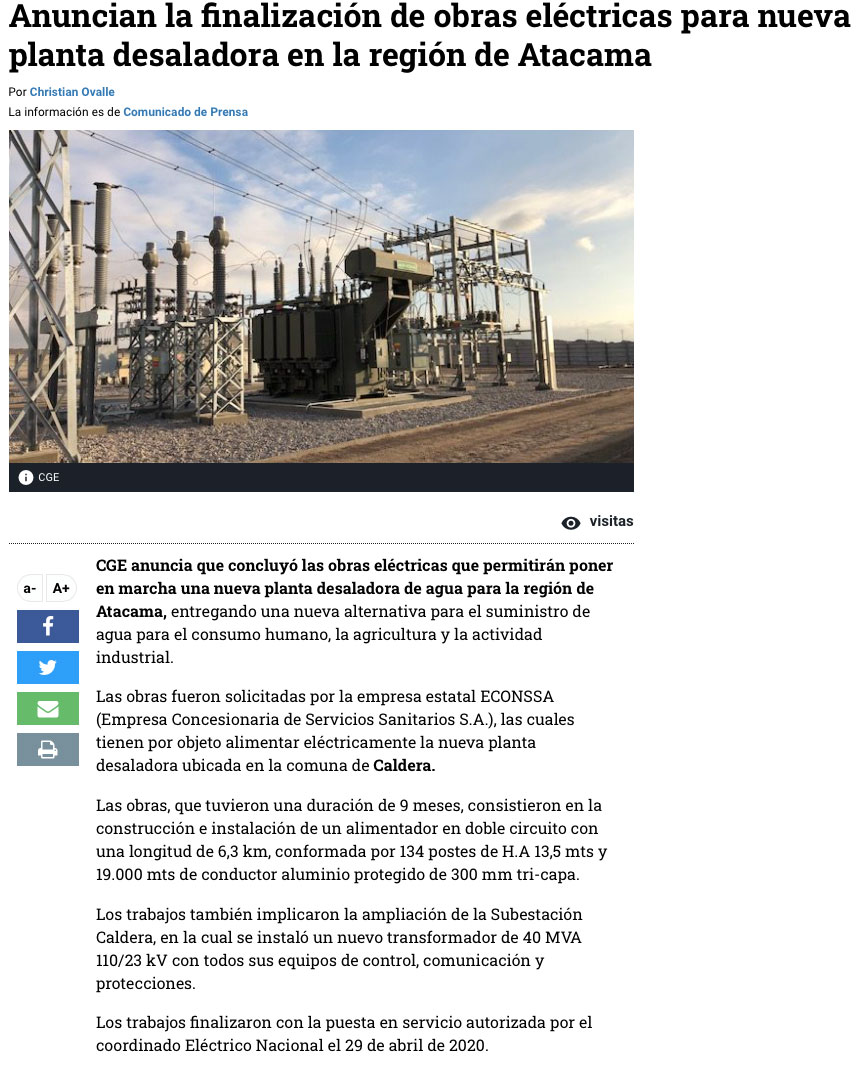 CGE finaliza obras para nueva planta desaladora en la región de Atacama - (biobiochile online)